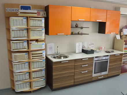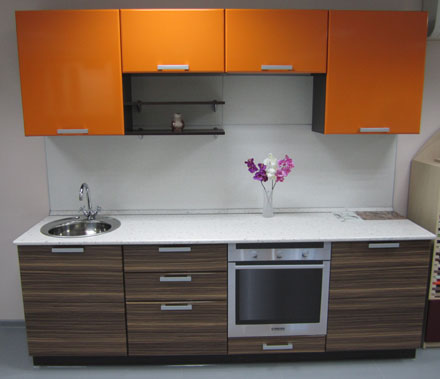 Фасады МДФ в пленке ПВХ верх оранжевый глянец, низ зебрано глянец, столешница постформинг.